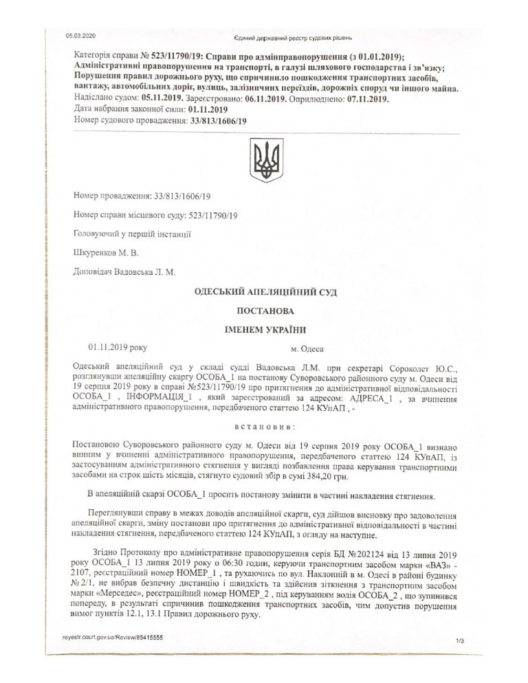 В Одесском апелляционном суде мы добились отмены постановления Суворовского районного суда г. Одессы и взыскание в виде лишения права управления транспортными средствами было заменено на штраф в размере 340 грн.