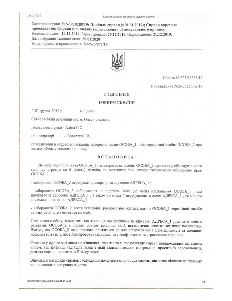 В Суворовском районном суде г. Одессы мы добились удовлетворения заявленных требований, судом выдано ограничительное предписания на 6 месяцев, которым ему запрещено приближаться к заявителю на расстояние 300м, вести телефонные разговоры или контактировать с ней через другие средства связи лично и через третьих лиц.